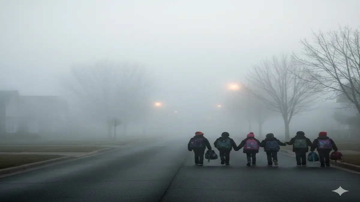 घने कोहरे और ठंड के बीच सुबह स्कूल जाते छोटे बच्चे, सड़क पर दृश्यता बेहद कम