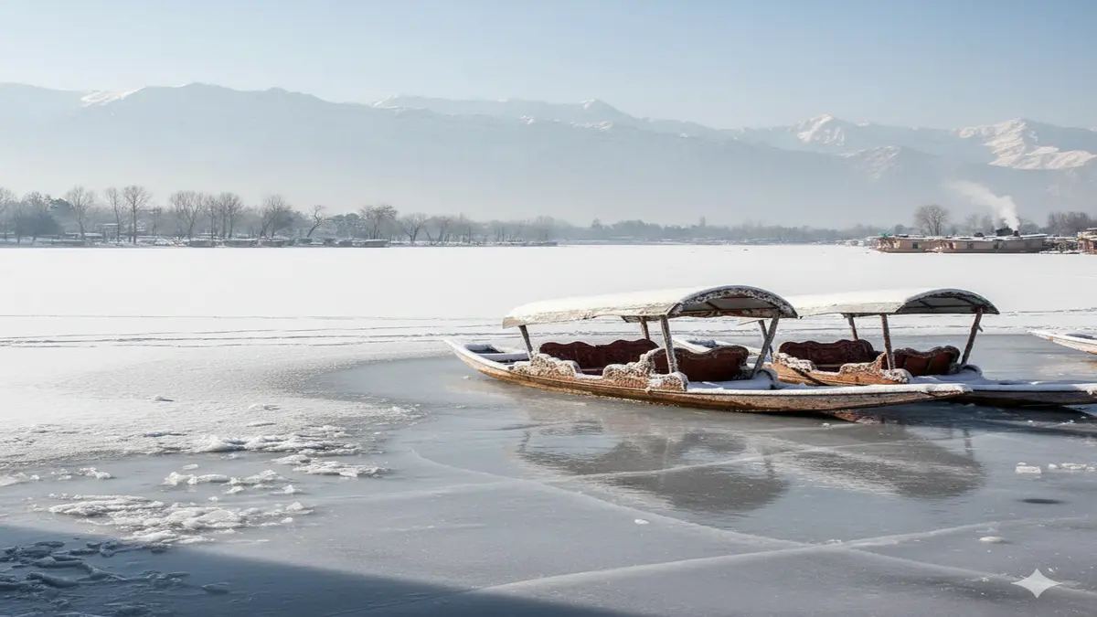 कश्मीर घाटी में कड़ाके की ठंड के चलते डल झील के कई हिस्से जम गए हैं, जिससे शिकारा नावें बर्फ में फंसी नजर आ रही हैं।